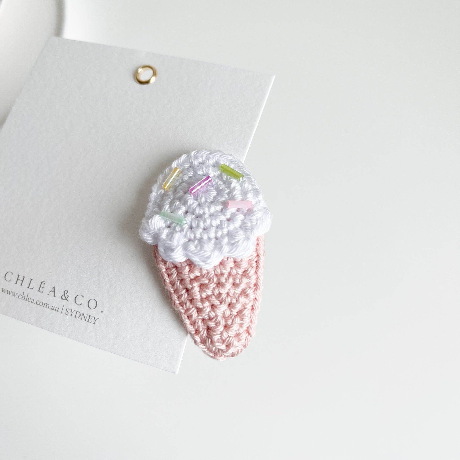 Expertly hand-crocheted, these miniature ice cream cone hair accessories are the perfect blend of cute craftsmanship and secure styling, making them a must-have accessory for any sweet little trendsetter.